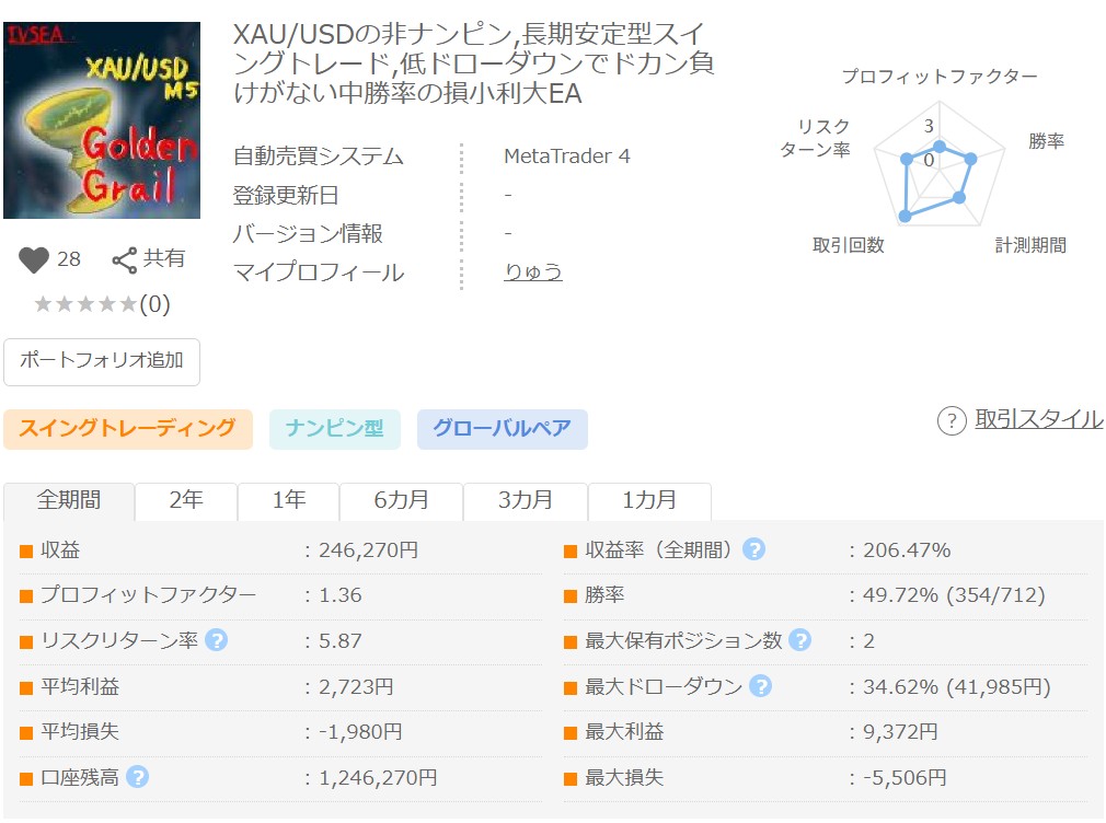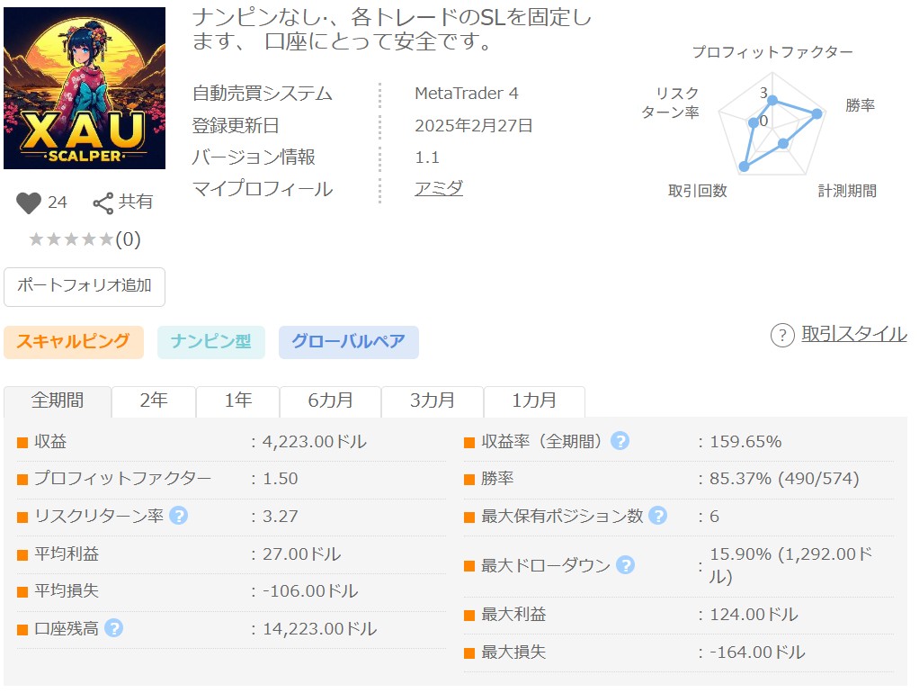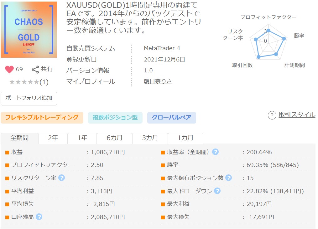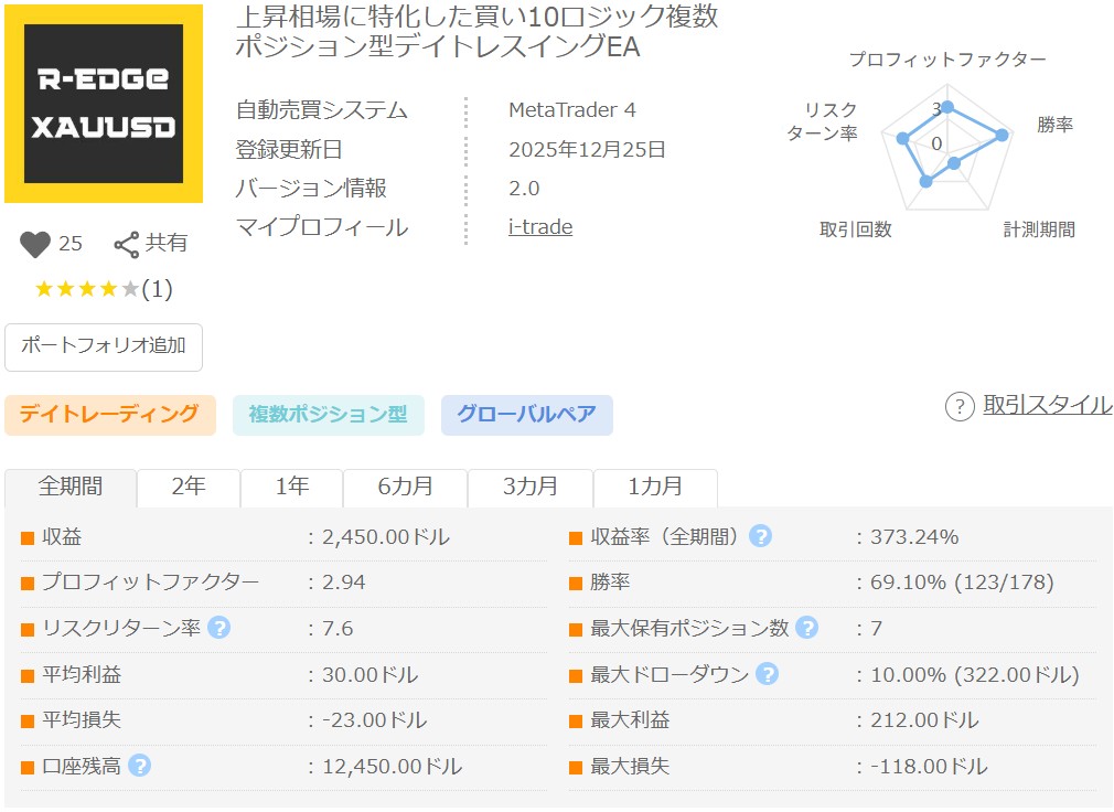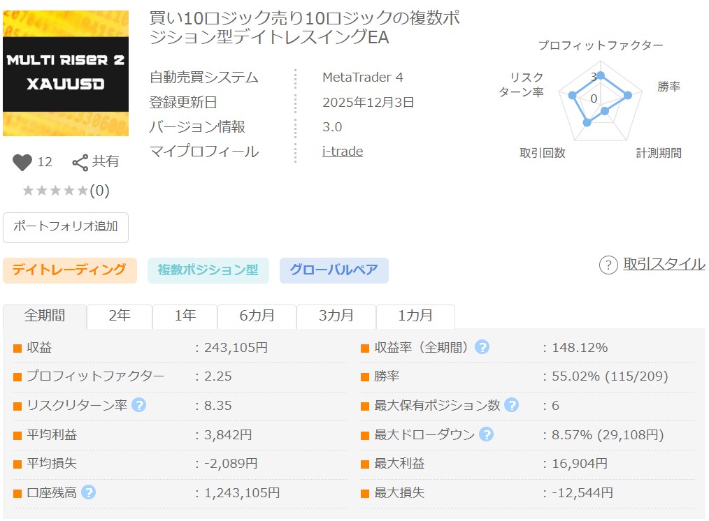 XAUUSD特有の値動きを活かし、月火水金の10時と23時にエントリーし、23時に決済する定刻・アノマリー系のデイトレ、スイングEA。基本両建てでエントリーを行うことが多く、買いについてはナンピンのようにポジションを追加していくことがあります。デモフォワードは4年が経過していますが破綻なく安定的に推移し収益率は200%に到達、PF、RFとも非常に高い数値となっており、当ブログの2025年「年間EA評価ランキング」でも2位にランクインしています。ポジション数はデフォルトで最大30と多く、リスクも高いので、十分な証拠金で余裕を持った運用が必要となるEAです。