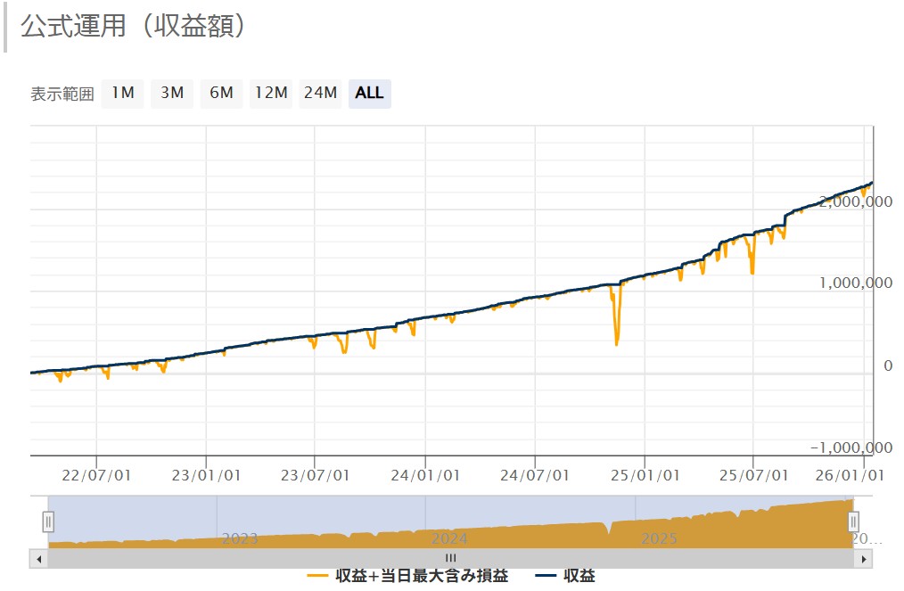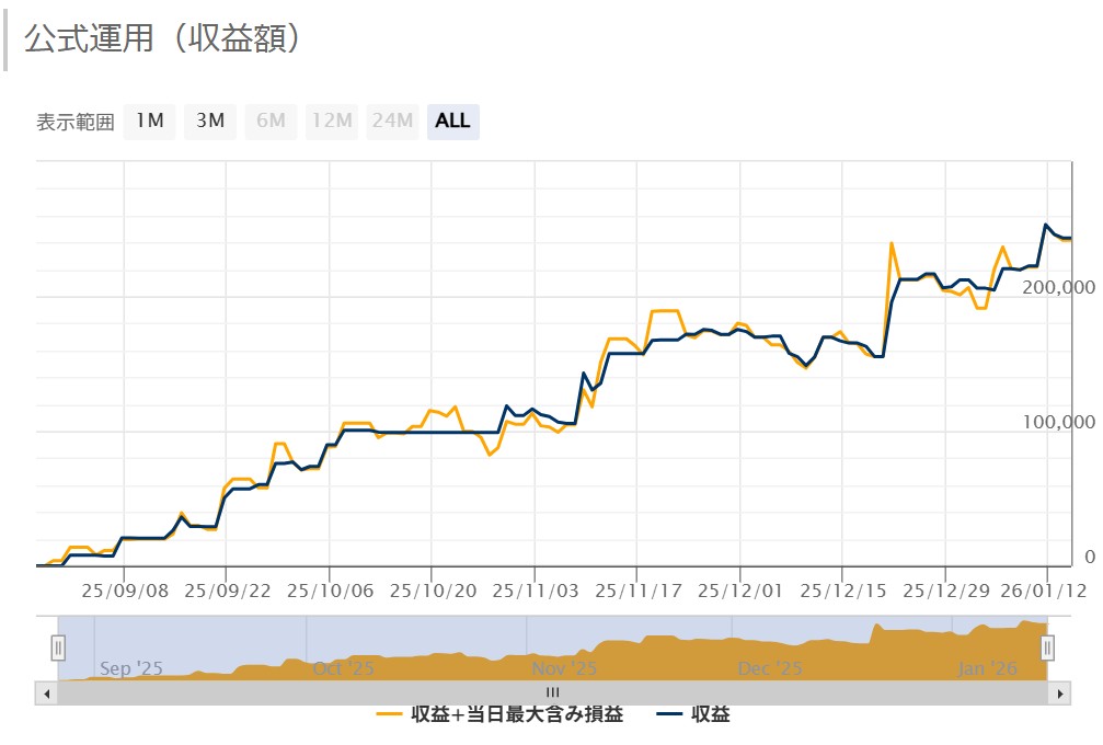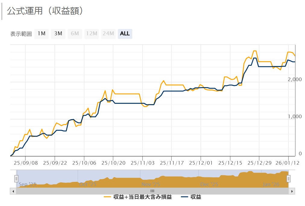 上昇相場で大きく利益を得ることを目的とした買い専用マルチロジックの損小利大デイトレ、スイングEA。取引は全て注文を逆指値で行う順張りのEAとなっています。それぞれが独立して単一のポジションを保有する100個以上のロジックから厳選された10のロジックを搭載し、一つのロジックのドローダウンを他のロジックが補うことで、損益を平均化・安定化させることを狙っています。フォワード期間はまだ4ヶ月程度と短いですが(※MT4版、26年1月現在)、0.01ロットの単利運用で2450ドルの利益を獲得し、収益率は300%を超えています。なお各ロジックはマジックを0にすることでオンオフが可能で、複利運用にも対応しています。