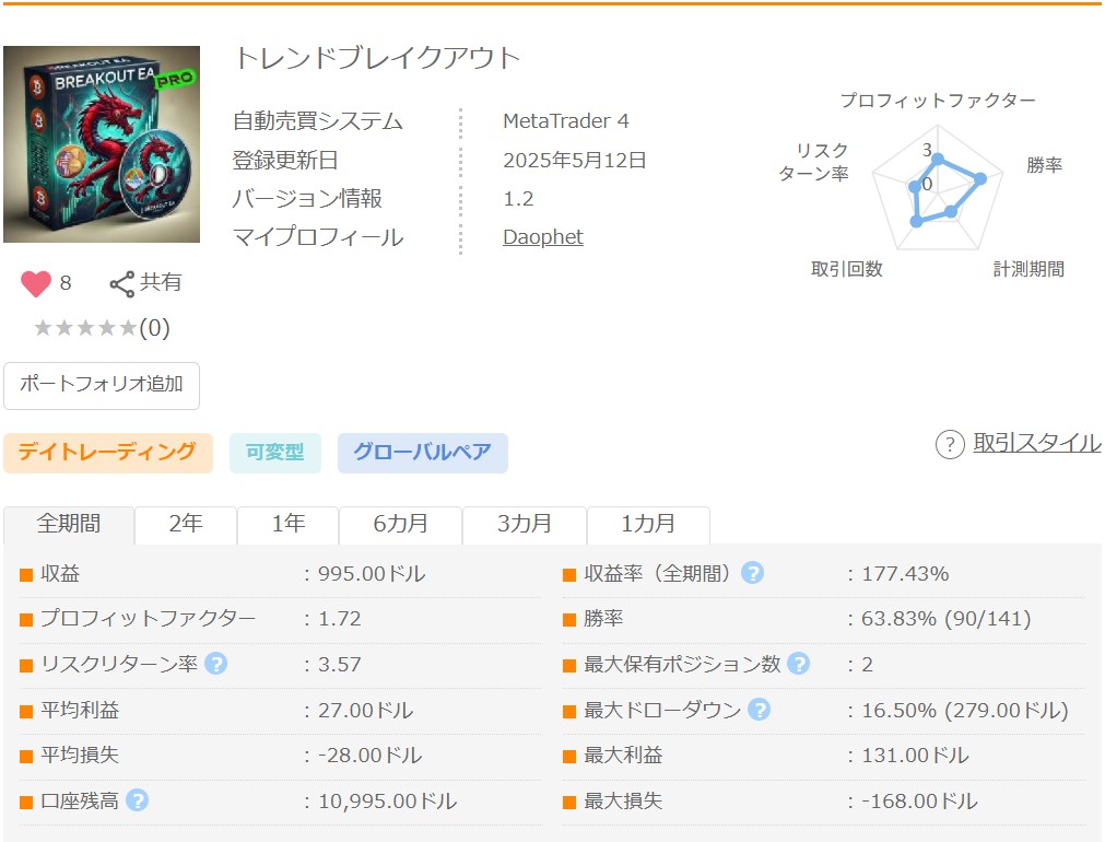 「機械学習(ML)と高度なアルゴリズムを用いて市場を分析し、ブレイクアウトパターンに基づいて注文をインテリジェントに行う自動化されたエキスパートアドバイザー」ということで、AIによる機械学習をもとに開発されたデイトレード、スイングタイプの損小利大EAです。紹介ページには、「ニューラルネットワークやディープラーニングなどの高度な技術を使用して、偽のシグナルをフィルタリング」「動的なサポート・レジスタンスレベルを検出し、突破の確率を予測 」「 市場のトレンドに応じて戦略を自動的に調整」と記載されており、この通りに稼働するとしたらかなり高度な機能を備えたEAと言えそうです。ただしリアルタイムのデータでAIが学習を行ってトレードに反映するといったシステムではないので、その点は注意が必要です。