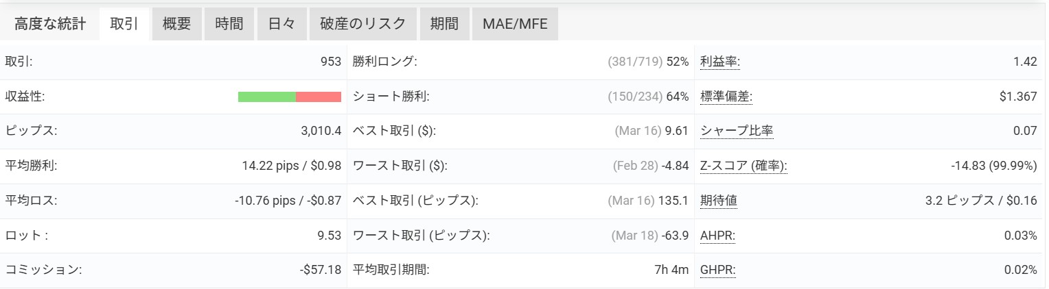 獲得pipsは約3000pipsでPF(「利益率」)は1.42と、スプレッドの大きいGBPCADが対象で1000回近いトレードを重ねていますが、なかなか良い成績を残しているのではないかと思います。
