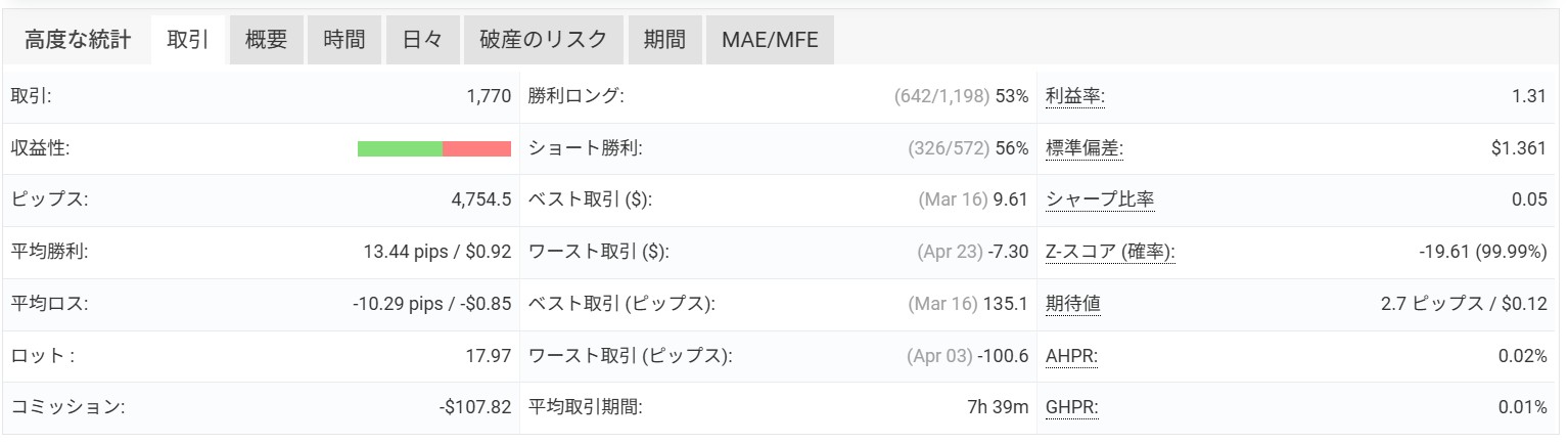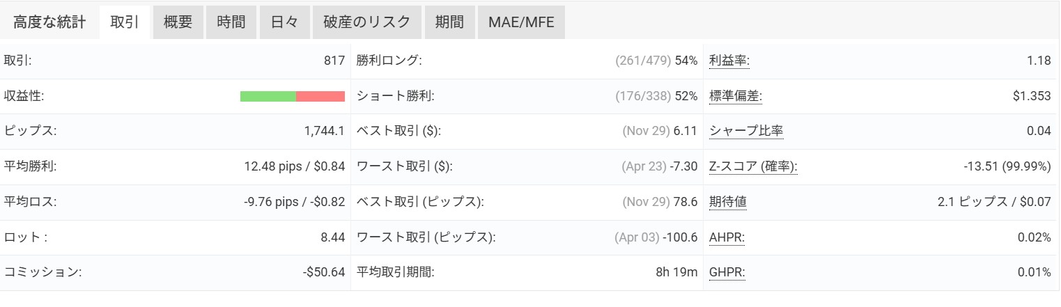獲得pipsは1744.1pipsなので、CSMV GBPCADに比べるとかなり少なく、PFも1.18とやや寂しい成績です。