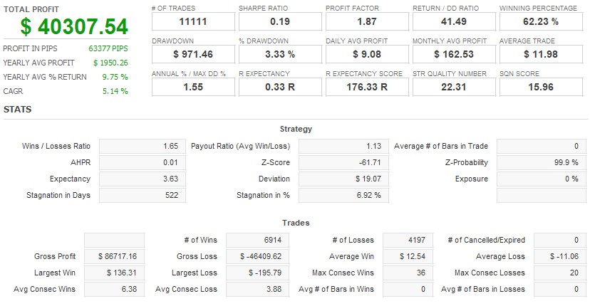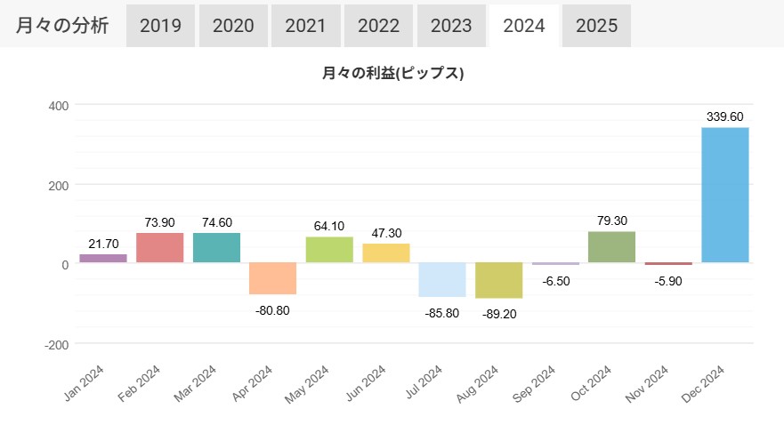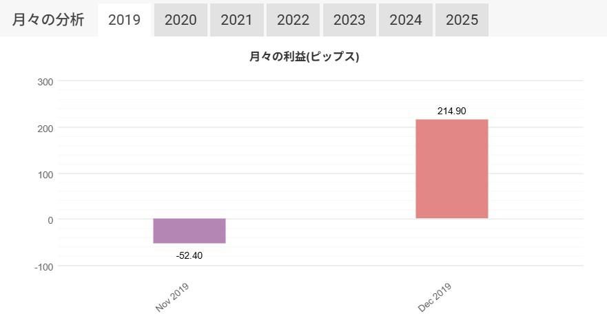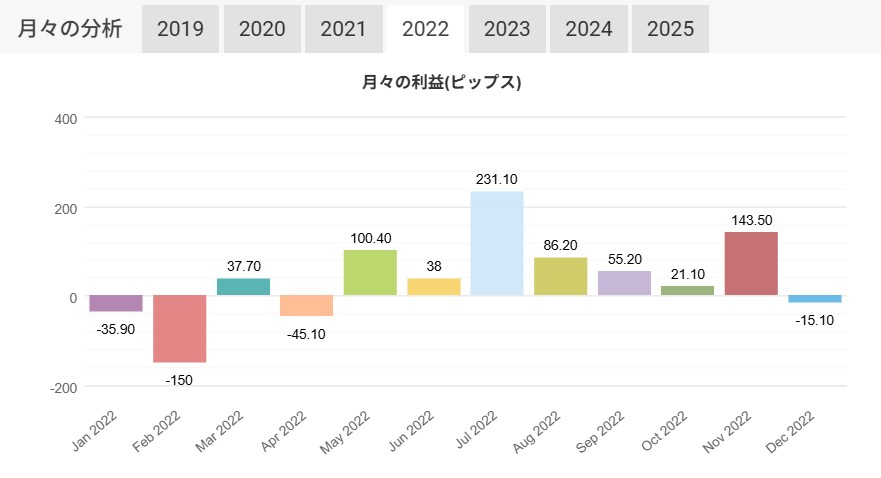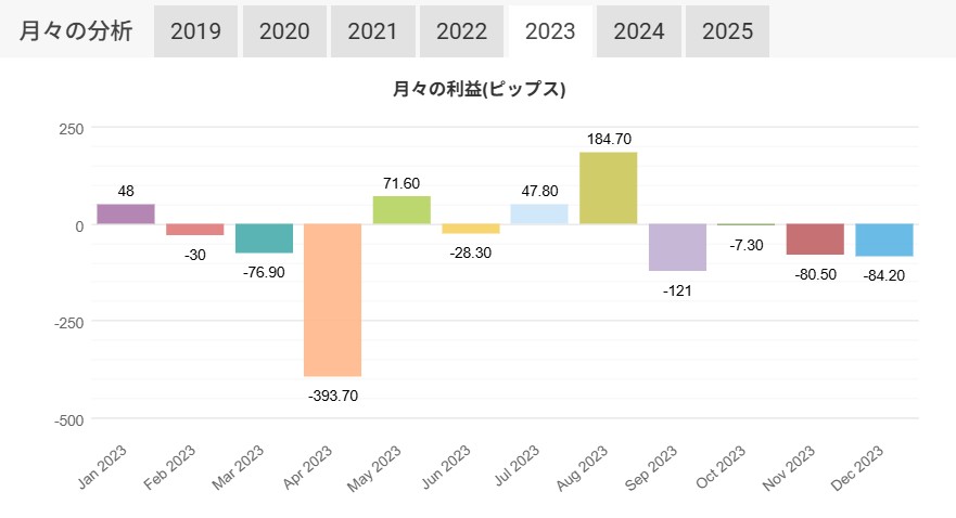 結果は下のようになっています。2023年がマイナスの成績となってしまいましたが、それ以外の年では全てプラス、トータルで4754.5pipsを獲得し、PFは1.31となっています。