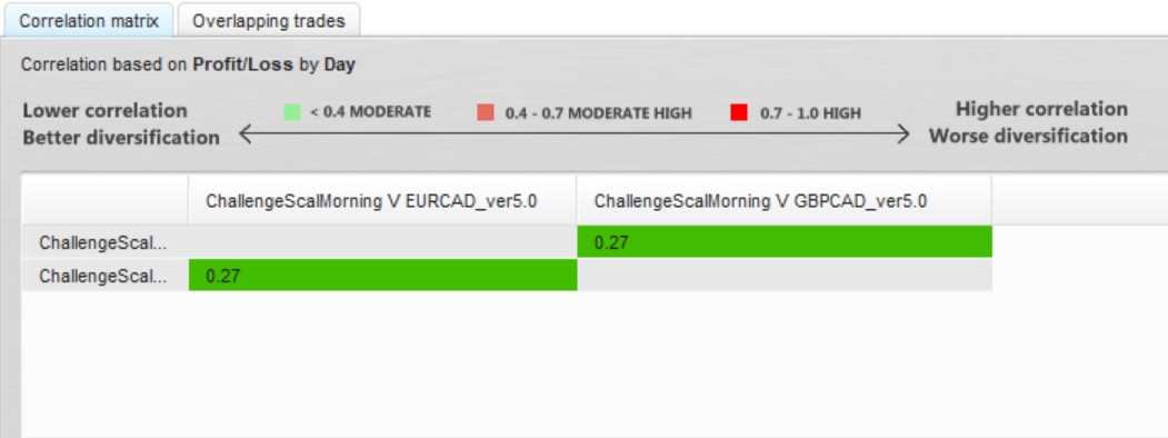 こちらは二つのEAの相関。同じ「CAD」を含んだ通貨ペアでの運用ですが、意外と相関は低いです。