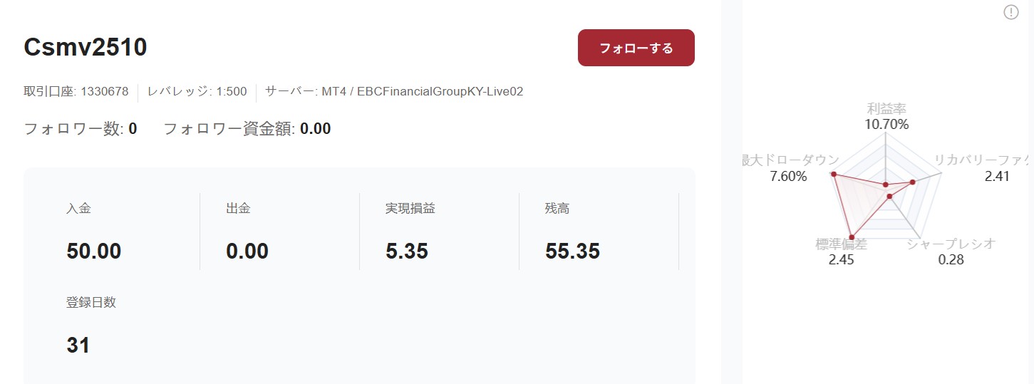 そして、今回ご縁があってこのEBCのコピートレードに当方(libertaction)のEA・ChallengeScalMorning V(CSMV) GBPCAD/EURCAD登録され、シグナル配信を提供させていただくことになりました。