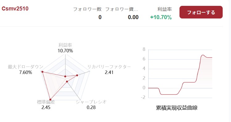 シグナル名は「Csmv2510」で、この一つのシグナルをフォローすることで、CSMVのGBPCADとEURCADの二つのEAの取引を同時にフォローできます。