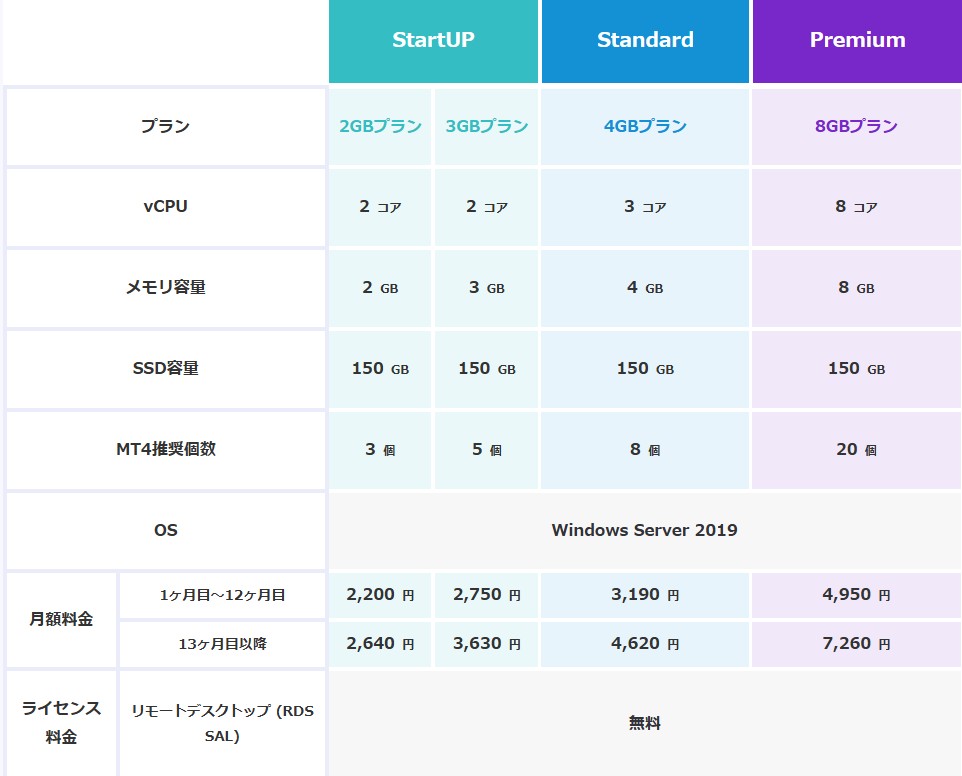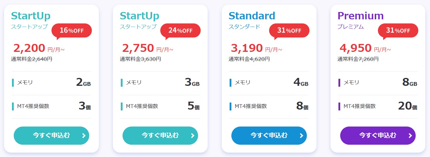 今回のキャンペーンの対象となる各プランの仕様および料金は下記の通りです。なおスタートアッププランはメモリ2GBのプランと3GBのプランがあります。