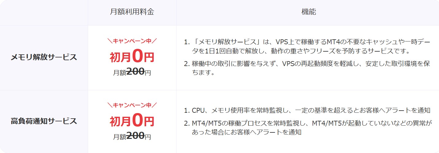 これまではCPU、メモリの使用率やMT4/MT5の稼働プロセスを常時監視し、基準超過や異常があった場合にアラートを通知してくる「高負荷通知サービス」がありましたが、今回新しく「メモリ解放サービス」というオプションサービスが加わっています。