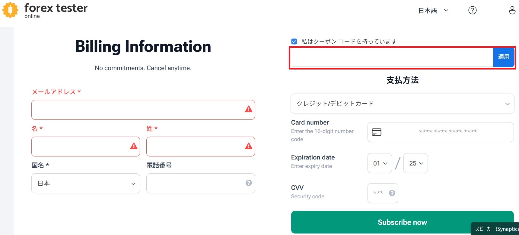 クーポンをご使用される場合は、購入画面に進んだ後右上の「私はクーポンコードを持っています」にチェックを入れ、クーポンコードを入力して「適用」をクリックしてください。
