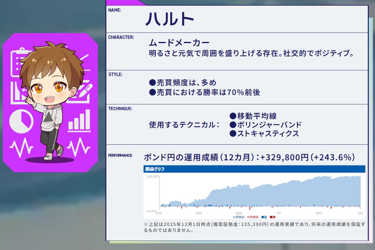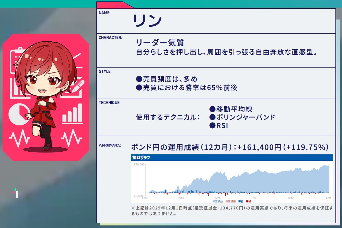 これらをキャラクターのプロファイルやランキング画面から直感的に把握できる点は、他の国内FX自動売買サービスにはあまり見られない特徴と言えるでしょう。