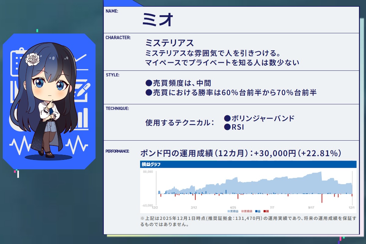 また各キャラクター(ストラテジー)の「プロファイル」で「どんな戦略なのか」「どんなインジケーターを使用しているのか」といった説明が分かり易く記載されており、キャラクターの親しみやすさと合わせて直感的に理解できる設計となっています。