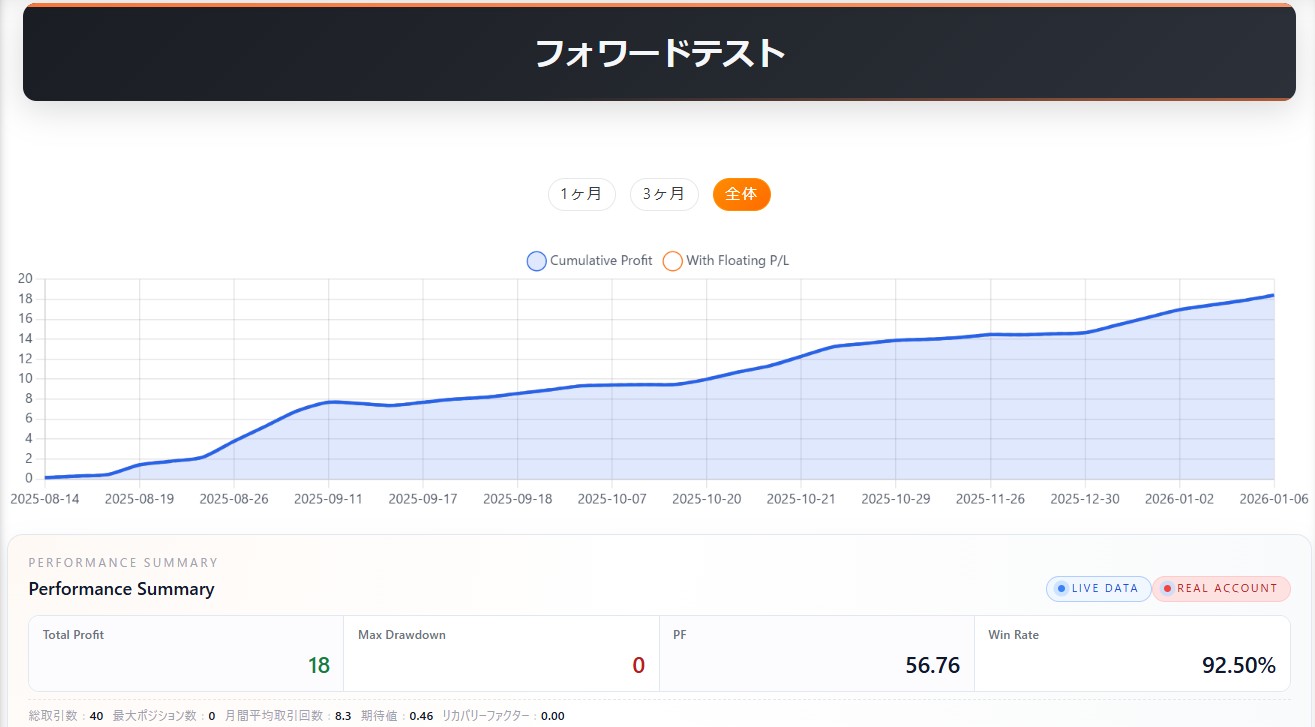 ちなみにシストレ.COM版は8月中旬くらいからフォワードを計測していますが(※RealTradeで公開しているものと同じ)、勝率92.5%、PF56.76という別のEAの間違いではないかと思うぐらいの成績になってます。
