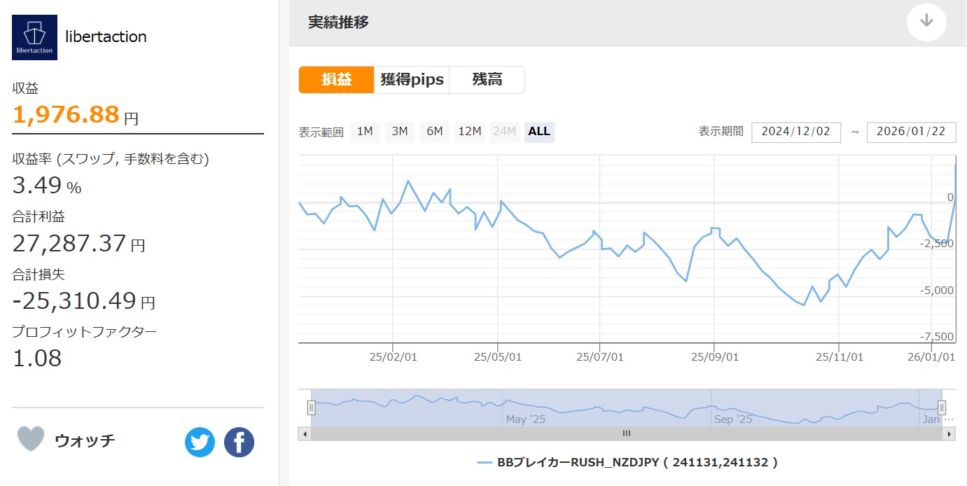 BBBreakerRush_NZDJPYは累計成績はまだまだですが、バックテストの成績も悪くないですし、希少なNZDJPYのスイングEAですので、今年利益伸ばしていって欲しいEAの一つです。