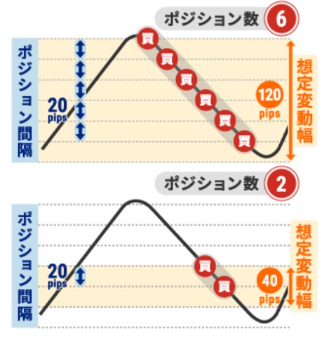・事前に想定変動幅、ポジション間隔、売り買いの方向などの設定が必要