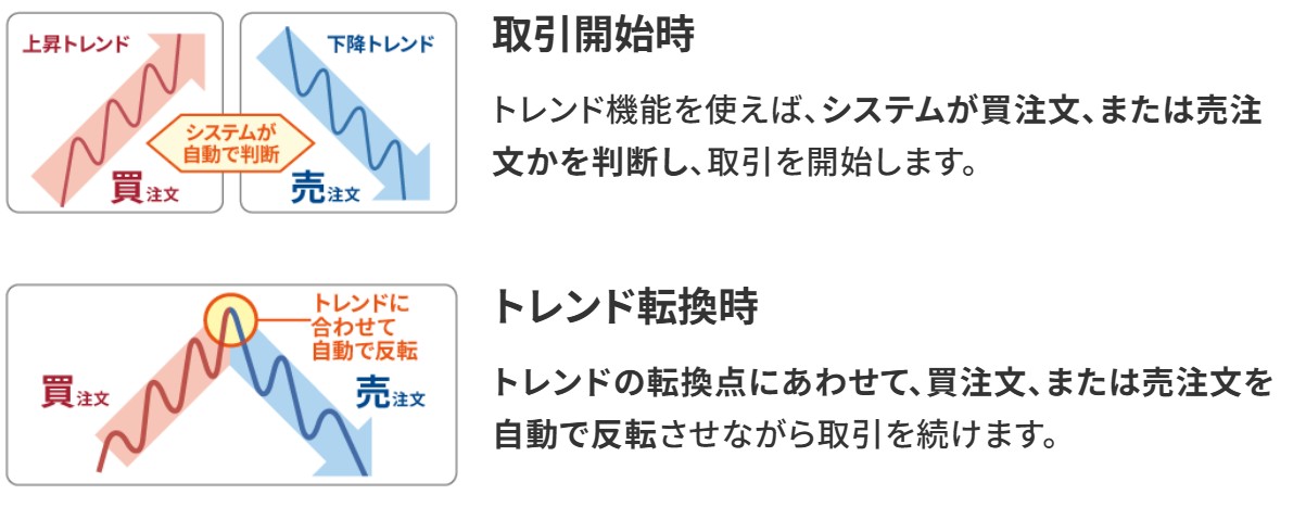 トレンド機能では、相場の方向性を自動で判断し、その方向に沿った取引を行います。
