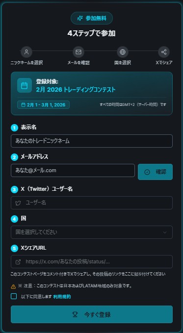 ※EA(自動売買)の使用は許可されますが、不正・濫用的な自動売買 は主催者の裁量で制限・失格対象となる場合があります。