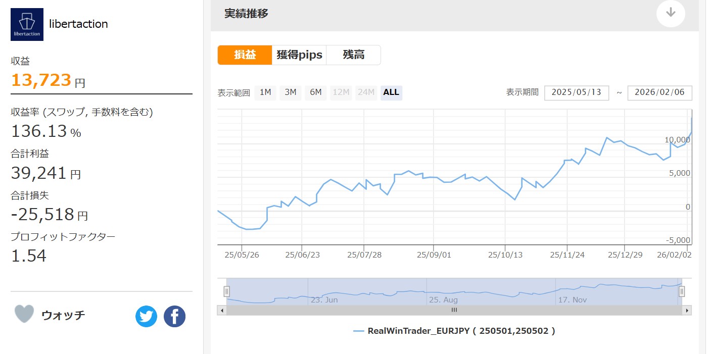さてオリジナルのEAですが、この円安トレンドの発生により、まず昨年から好調のRealWinTrader_EURJPYが400pips近い利益を獲得し、最高益を更新しました。12月以来の最高益更新です。