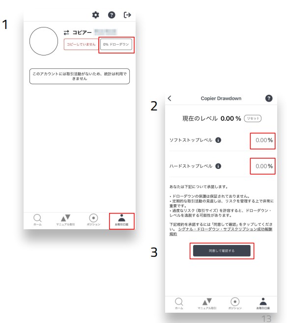 ①ソフトストップレベル・・・新しい取引がコピーされなくなる最大ドローダウンレベル