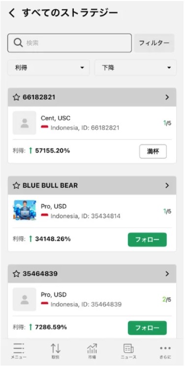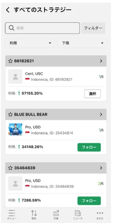 3000以上のストラテジー数が登録されており、ストラテジーの数はコピートレードを提供している業者の中でもトップクラスです。