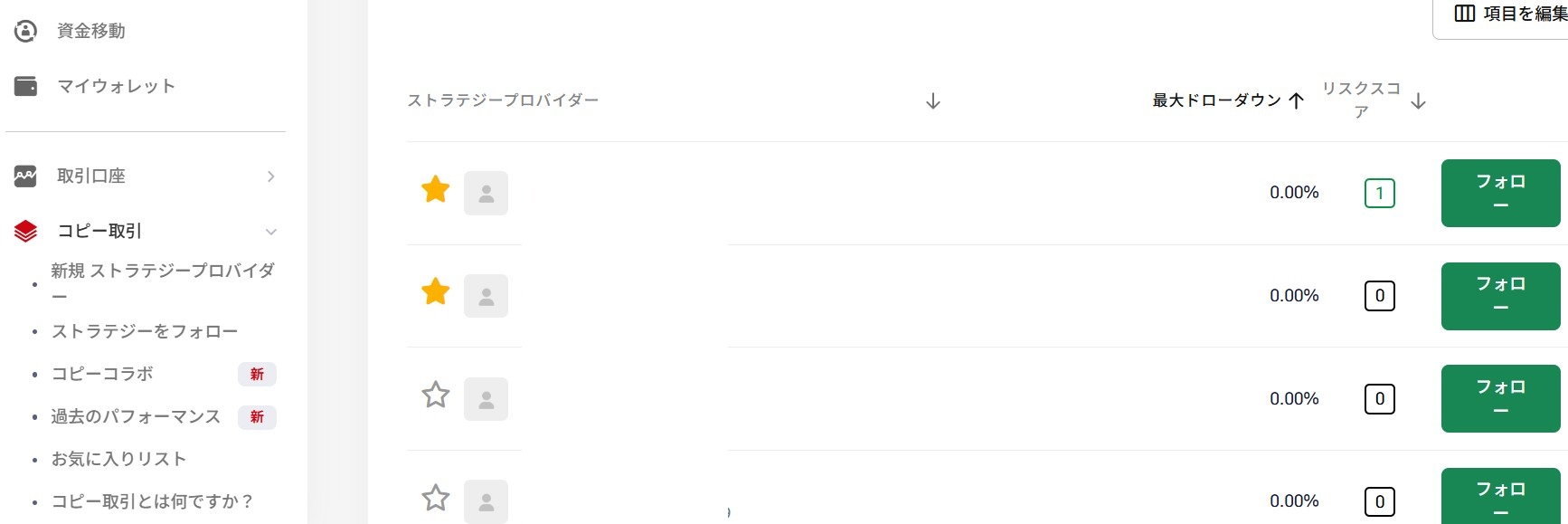 ☆にチェックを入れたストラテジーは、まとめて左の「コピー取引」のメニューにある「お気に入りリスト」から見ることができます。
