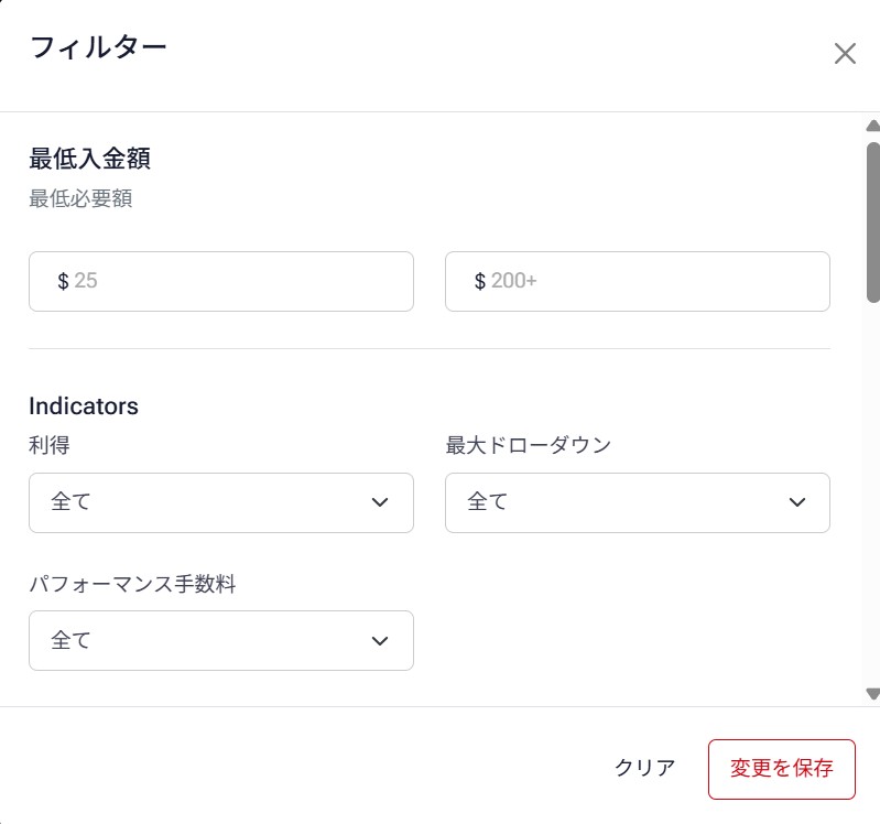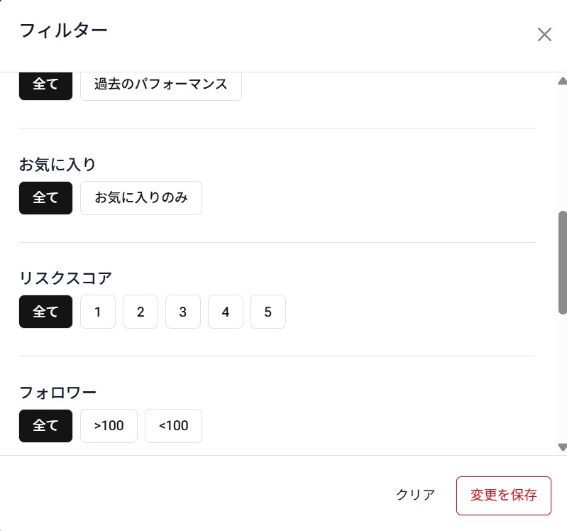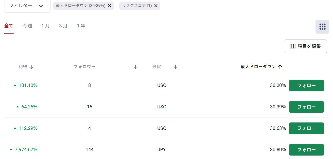 この機能を使って検索をかければ、既述の「最大ドローダウン」や「リスクスコア」でも絞り込めますので、事前にハイリスクなストラテジーを排除することも可能です。