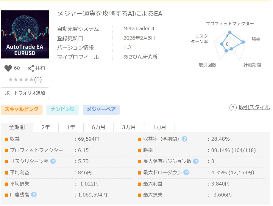 5分足使用のEURUSD専用のAI搭載EA。スプレッド最低値を3pipsという厳しい条件に設定した変動スプレッドという過酷な条件下で約22年分のヒストリカルデータを用いた機械学習によって売買モデルを構築。さらにこの学習の基準として、①総獲得pips、②プロフィットファクター、③含み損込みでの最大DD、④保有時間単位での利益の大きさ(「時間効率性」)といった要素を重視。しかも学習用データと検証用データを分けて「過学習」の防止に努めるなど、徹底した拘りで堅牢性と安定性を追求したEAとなっています。その結果0.1ロット固定での20年超1万回を超える取引でのバックテスト(変動スプレッド)では、収益率750%(=利益÷初期口座資金)、PF3.95、RF91.16というとてつもない数値を出しています。取引スタイルも3つのモード(「通常」「小さい利益」「大きい利益」)から選択でき、複利機能も搭載。フォワード期間がまだ短いため、今後の成績推移が注目されるEAです。なお、GBPUSD版(オートトレードAI-GBPUSD)もあります。