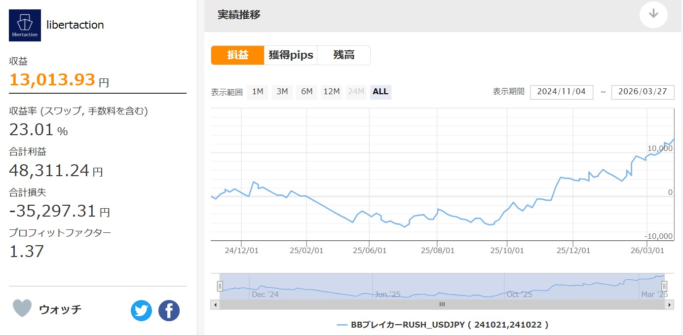 そしてここのところ毎週のように最高益を更新しているドル円のスイングEA・BBBreakerRush_USDJPYが、今回もこの機会を捉えて約120pipsの利益を獲得し最高益を更新。
