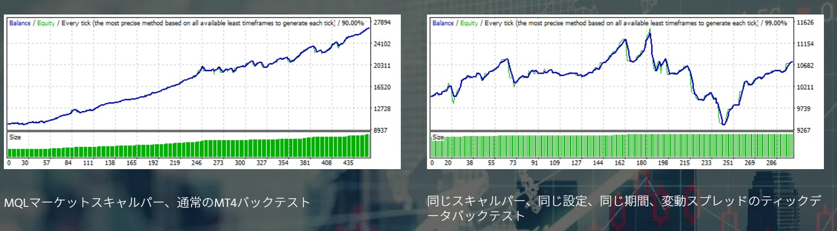 例えばこちらは公式サイトで公開されている同設定、同期間でのスキャルピングEAのバックテストの比較になりますが、左が通常のMT4のストラテジーテスターで行ったバックテスト結果、右側がTDSを使用して変動スプレッドで行ったバックテストの結果になります。