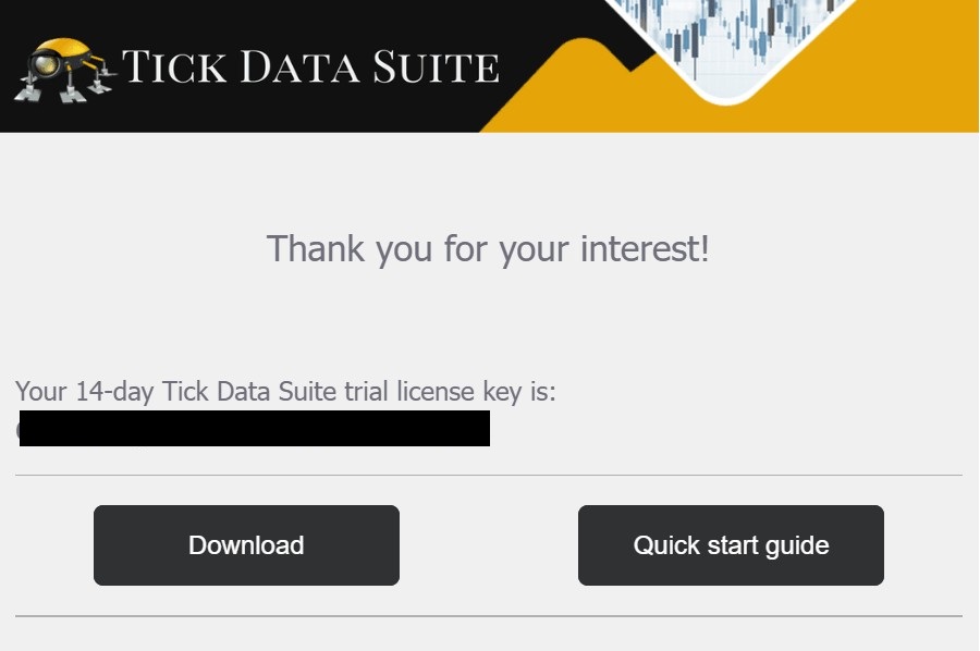 ③すると先ほど入力したアドレス宛に下記のメールが届いているはずですので、「Download」をクリックしてTick Data Mnagerをダウンロードしてください。その際、ライセンスキーの入力が求められますので、メールに記載のあるキーをコピペしてダウンロードを進めて下さい。