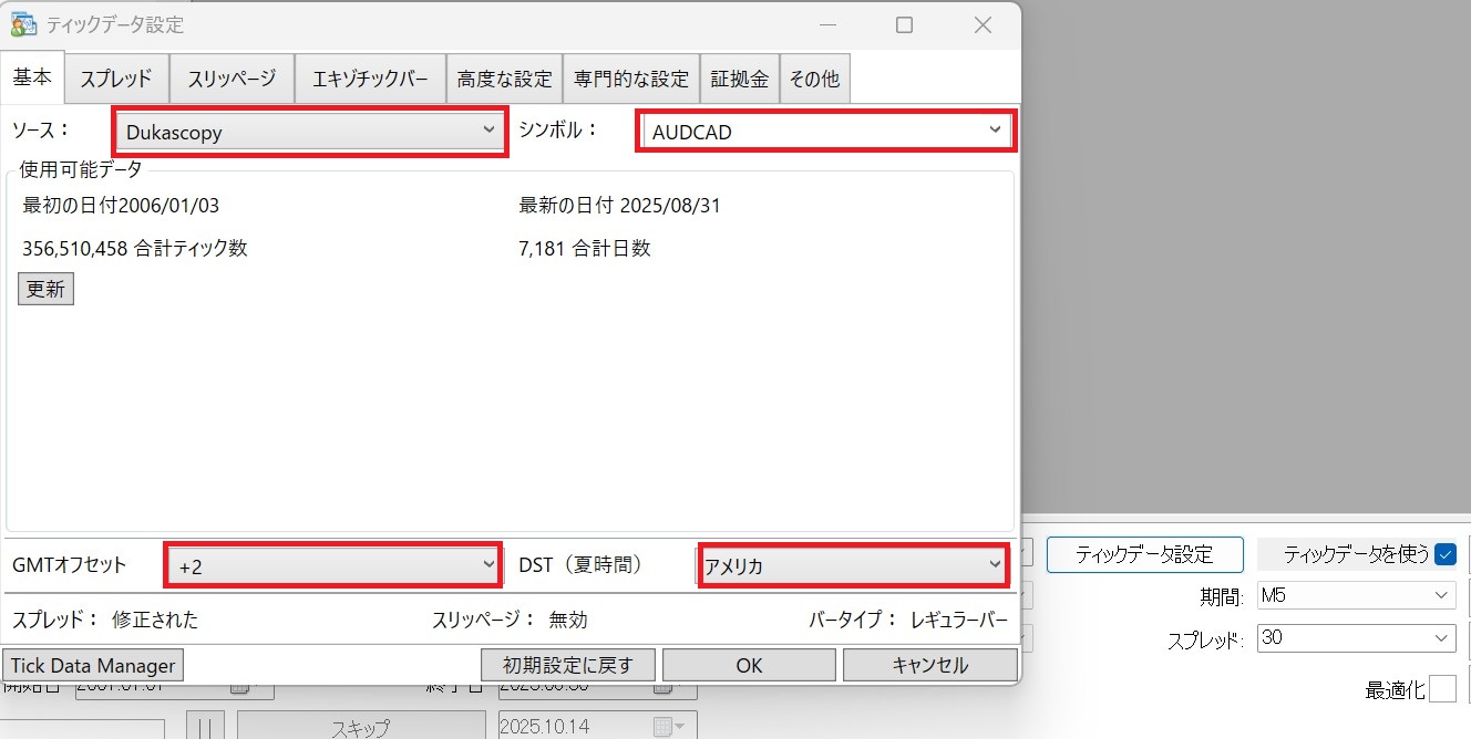 その上で、「ティックデータを使う」にチェックを入れ、「ティックデータ設定」(下記画像)でソースとシンボルを指定し、EAを実際に稼働させる業者と同じ条件でテストしたい場合は、GMTオフセットと夏時間も業者の条件に合うよう選択してください。