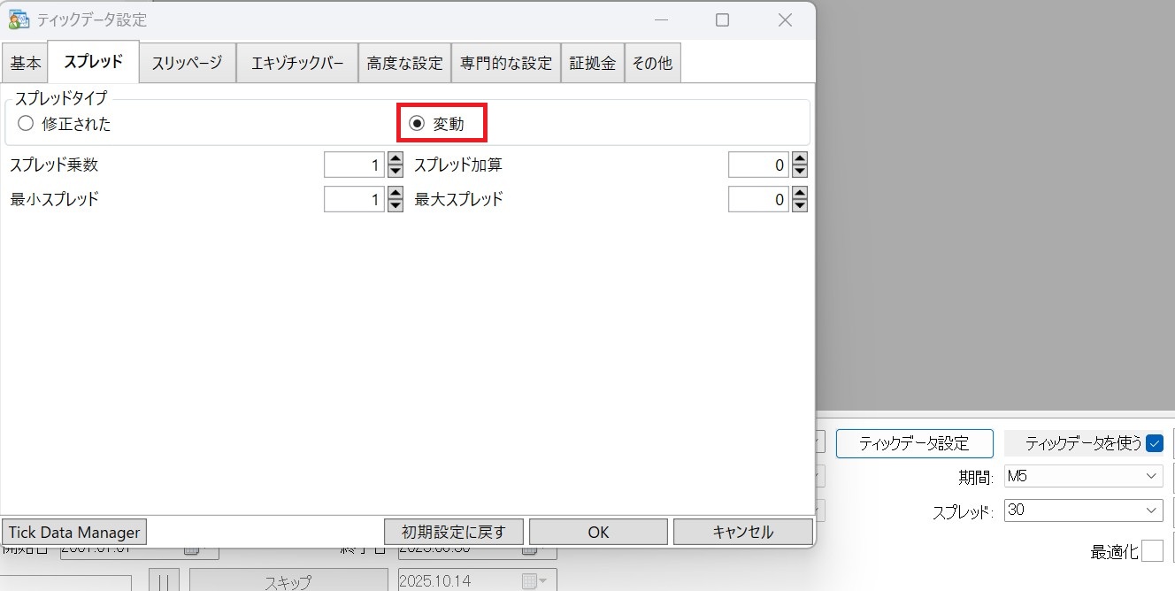 ここからは変動スプレッドを使用してのバックテスト方法について。