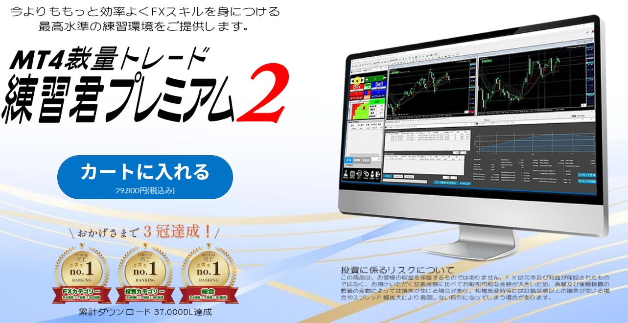 これは公式サイトのページですが、左下に「累計37,000ダウンロード達成」とある通り、練習君プレミアム2は国産のFX練習ツールとしては最も知られている人気ツールなんです。