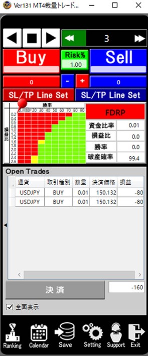 売買注文ボタンの下部には「資金比率」「損益比」「勝率」「破産確率」が表示され、さらにその下に保有ポジションの一覧が表示されます。